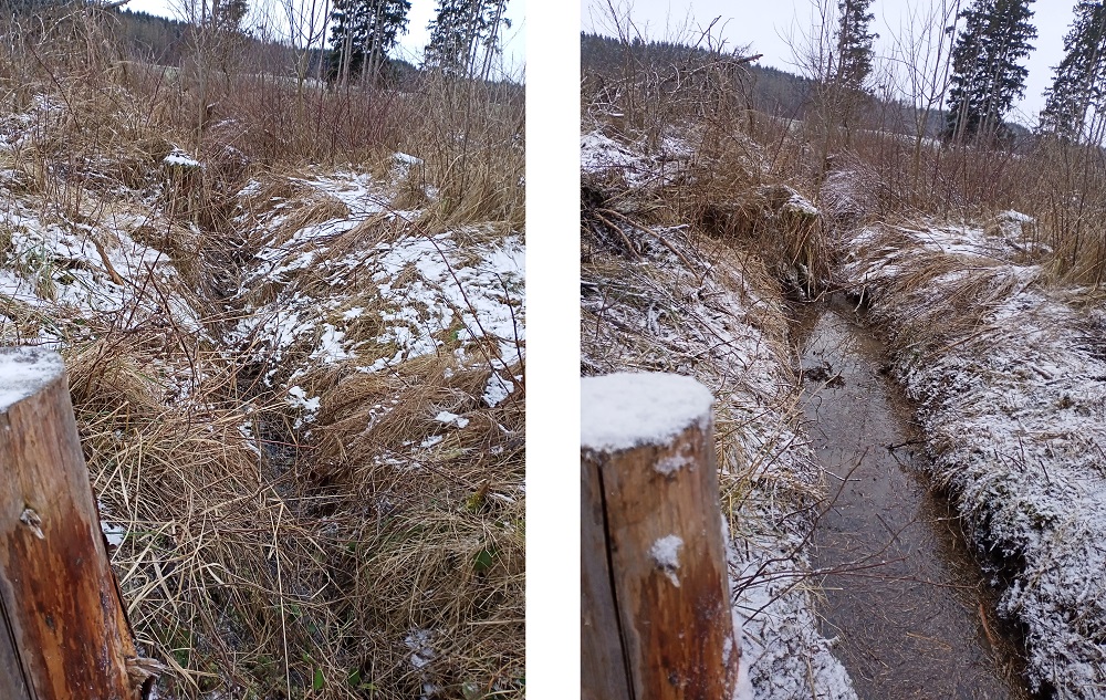 2021 habe ich einen kleiner Damm aus Stämmen gebaut. Dadurch trocknen der Graben im Sommer nicht aus und im Winter können sich die Wasserlebewesen besser vor Frost schützen. 2022 beginnt die hart Arbeit. Meter für Meter werden Pflanzen an der Böschung zurück geschnitten. Äste, Zweige, einige Pflanzen und auch Schlamm werden aus den Gräben soweit entfernt, das eine zusammenhängende Wasserfläche entsteht. Durch regelmäßige Pflege (alle 3-5 Jahre) können solche Gräben mit relativ geringem Aufwand erhalten werden.